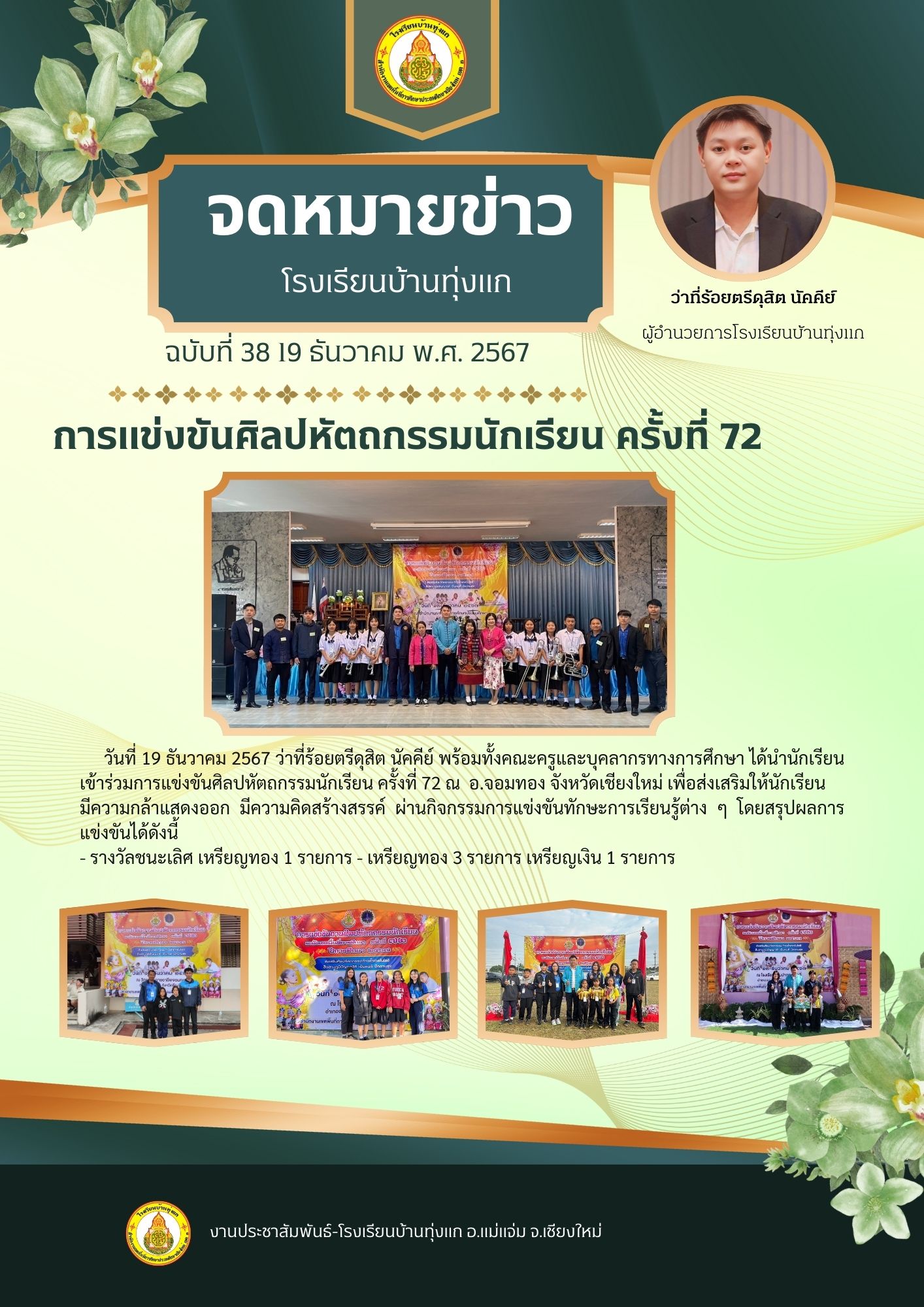 วันที่ 19 ธันวาคม 2567 ว่าที่ร้อยตรีดุสิต นัคคีย์ พร้อมทั้งคณะครูและบุคลากรทางการศึกษา ได้นำนักเรียนเข้าร่วมการแข่งขันศิลปหัตถกรรมนักเรียน ครั้งที่ 72 ณ อ.จอมทอง จังหวัดเชียงใหม่ เพื่อส่งเสริมให้นักเรียน
