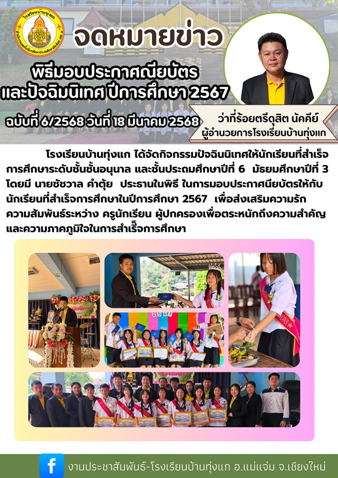 โดยมี นายชัชวาล คำตุ้ย ประธานในพิธี ในการมอบประกาศนียบัตรให้กับนักเรียนที่สำเร็จการศึกษาในปีการศึกษา 2567 เพื่อส่งเสริมความรัก
