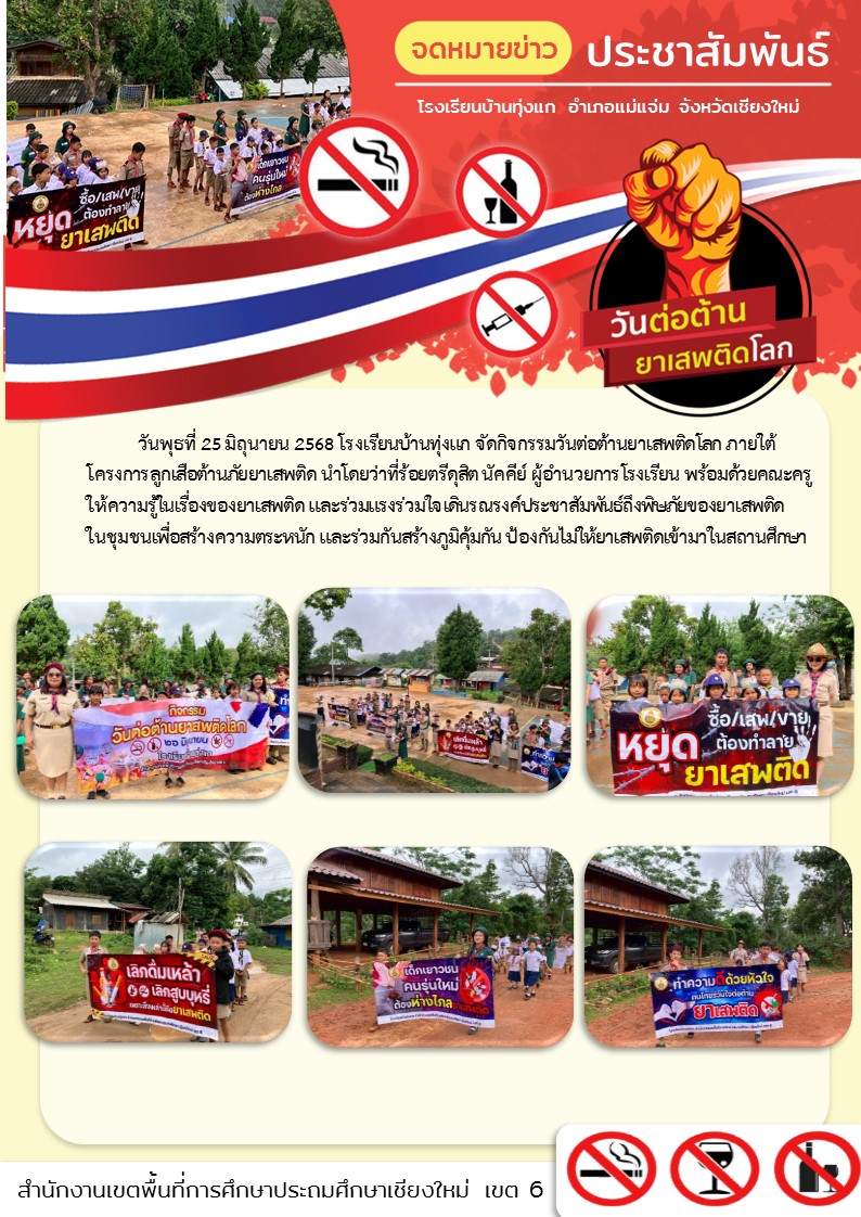 วันพุธที่ 25 มิถุนายน 2568 โรงเรียนบ้านทุ่งแก จัดกิจกรรมวันต่อต้านยาเสพติดโลก ภายใต้โครงการลูกเสือต้านภัยยาเสพติด นำโดยว่าที่ร้อยตรีดุสิต นิคคีย์ ผู้อำนวยการโรงเรียน พร้อมด้วยคณะครู ให้ความรู้ในเรื่องของยาเสพติด และรณรงค์เชิญชวนให้เด็กเยาวชนมีจิตสำนึกรับผิดชอบต่อตนเองและสังคม ในชุมชนเพื่อสร้างความตระหนัก และร่วมกันเสริมสร้างภูมิคุ้มกัน ป้องกันไม่ให้ยาเสพติดเข้ามาในสถานศึกษา