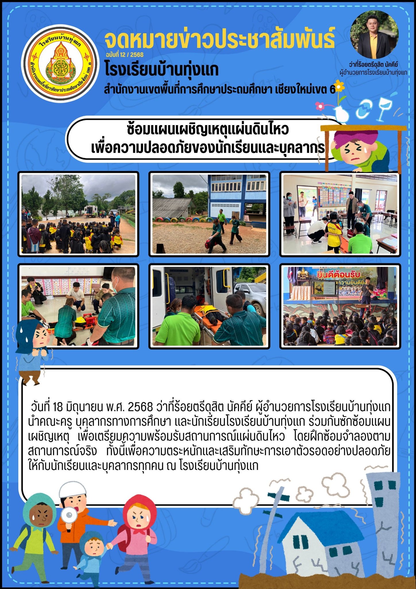 วันที่ 18 มิถุนายน พ.ศ. 2568 ว่าที่ร้อยตรีดุสิต นัคคีย์ ผู้อำนวยการโรงเรียนบ้านทุ่งแก นำคณะครู บุคลากรทางการศึกษา และนักเรียนโรงเรียนบ้านทุ่งแก ร่วมกันซักซ้อมแผนเผชิญเหตุ เพื่อเตรียมความพร้อมรับสถานการณ์แผ่นดินไหว โดยฝึกซ้อมจำลองตามสถานการณ์จริง ทั้งนี้เพื่อความตระหนักและเสริมทักษะการเอาตัวรอดอย่างปลอดภัยให้กับนักเรียนและบุคลากรทุกคน ณ โรงเรียนบ้านทุ่งแก
